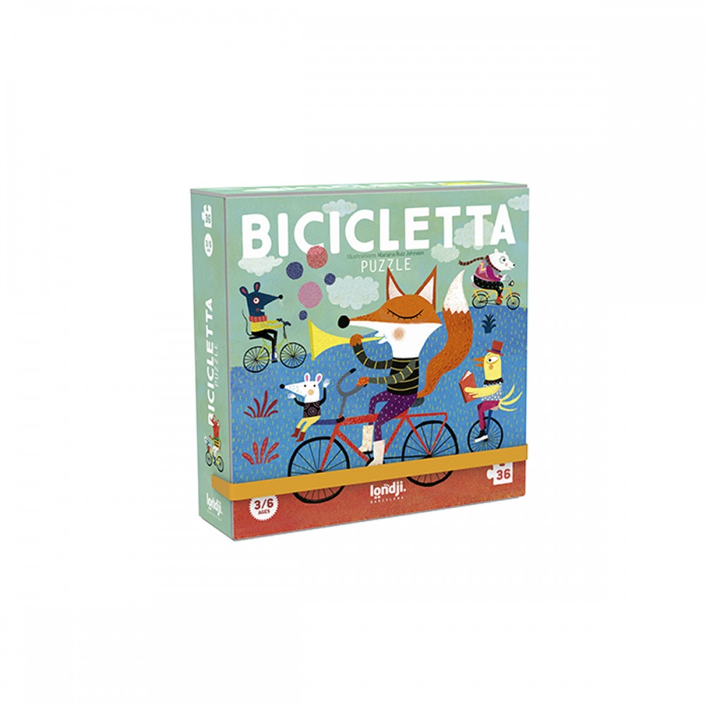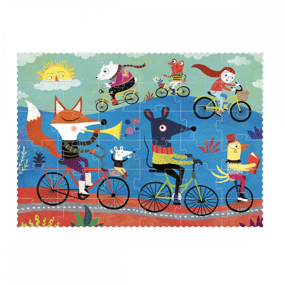 Bicycle Puzzle, a cute and beautiful 36-piece puzzle with a unique illustration. Grab your bike and join our friend the fox and the rest of the Londji cycling team for a fun ride!
